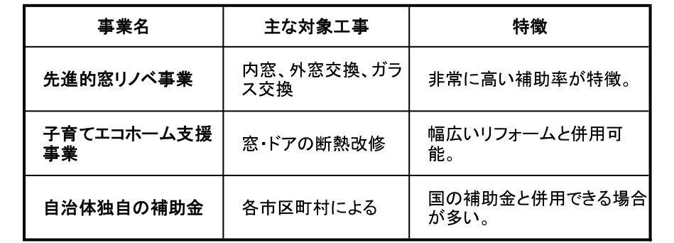 窓改修が対象となる主な事業には以下のようなものがあります。